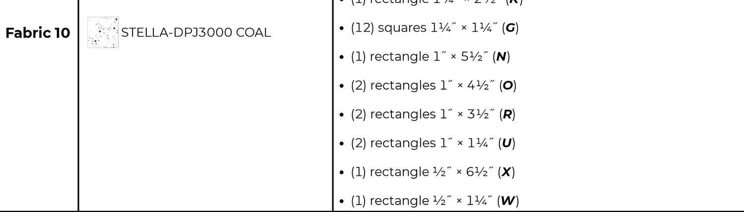 All patterns purchased prior to 9/2/2024 had an error on page 16. Fabric 10 (X) should be cut (1) rectangle 3/4˝ x 6 1/2˝ and Fabric 10 (W) should be cut (1) rectangle 3/4˝ x 1 1/4˝