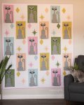 Foundation-pieced atomic stars and sparkling diamonds enhance cool cats with a retro vibe.